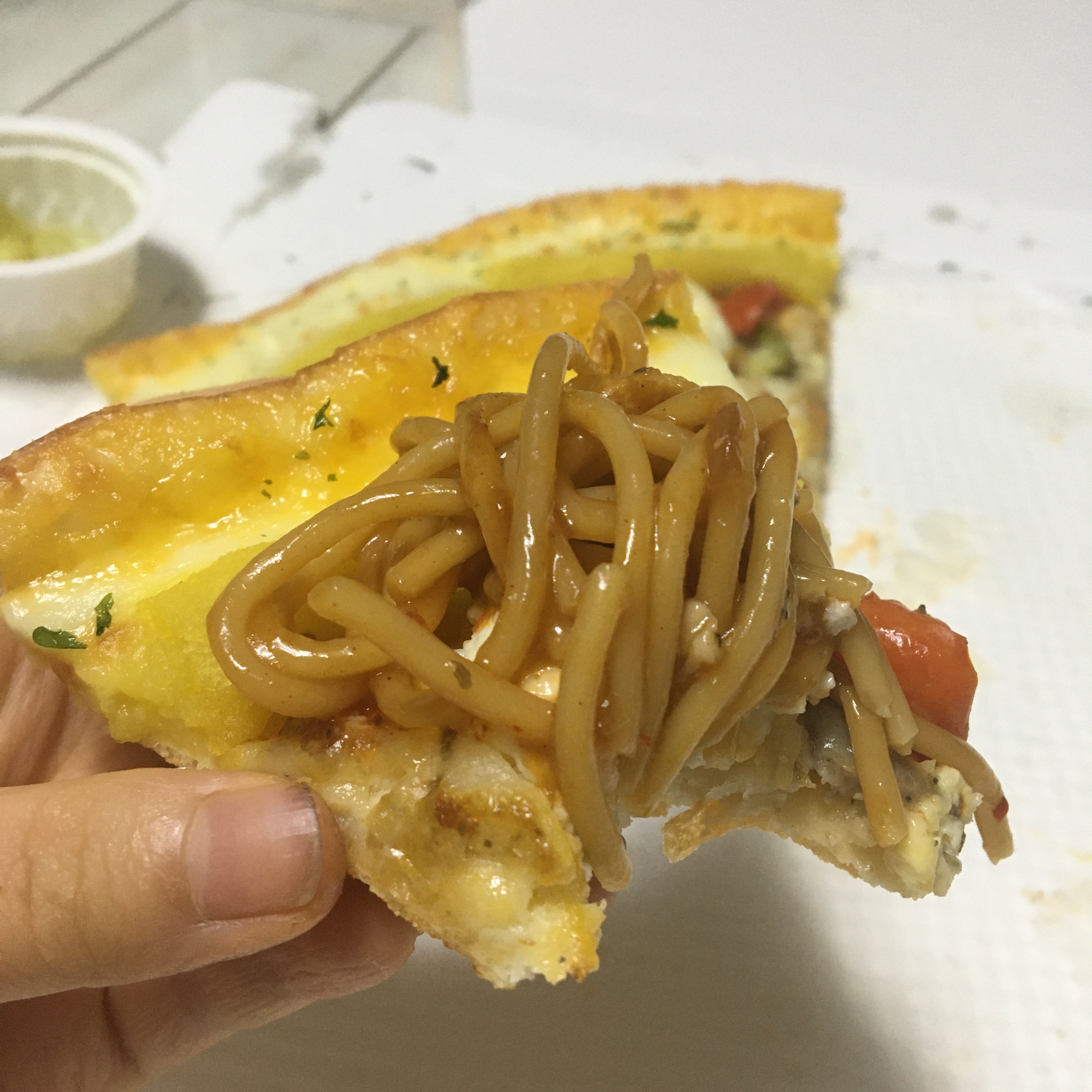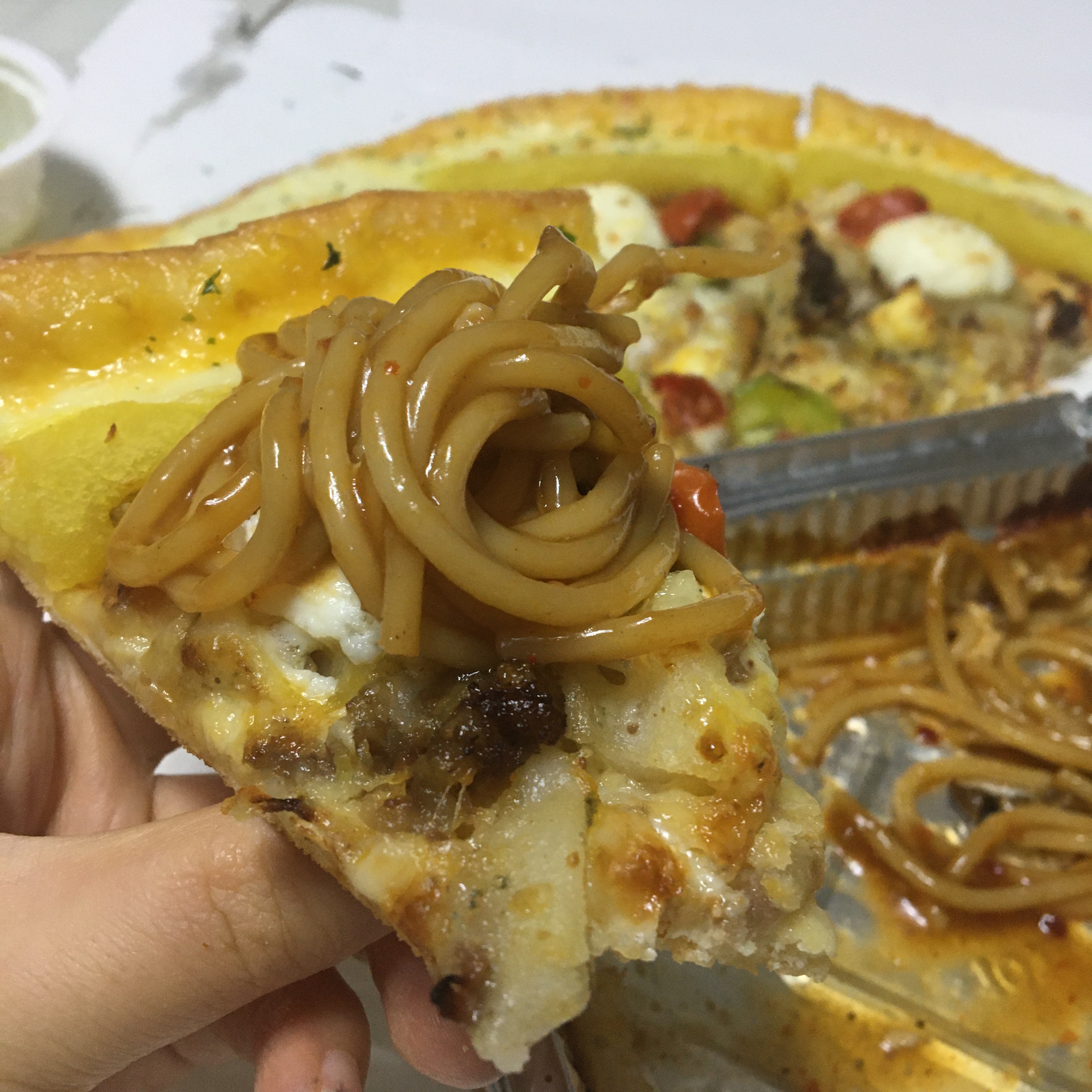 저렇게 피자위에 파스타를 올려먹었어요.